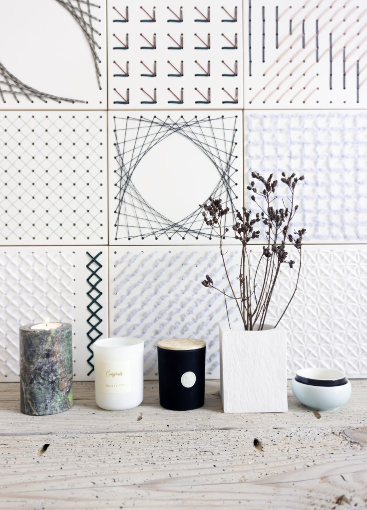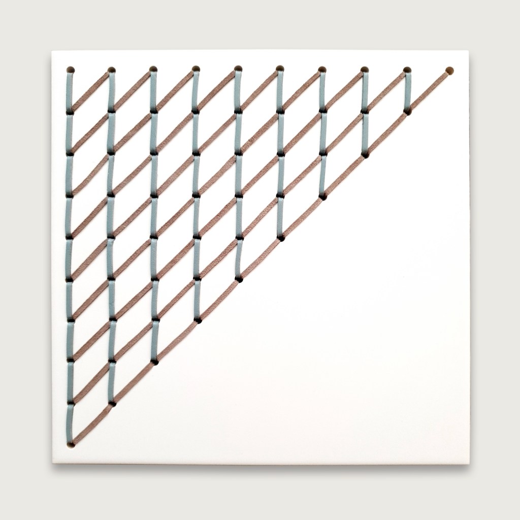 The nonconventional ceramic tiles were embellished using yarn, wool, elastic cords, natural leather, and synthetic materials. Their woven and embroidered structures were made possible through a system of precisely designed perforations – each with a diameter of 4 mm – integrated directly into the ceramic surface.